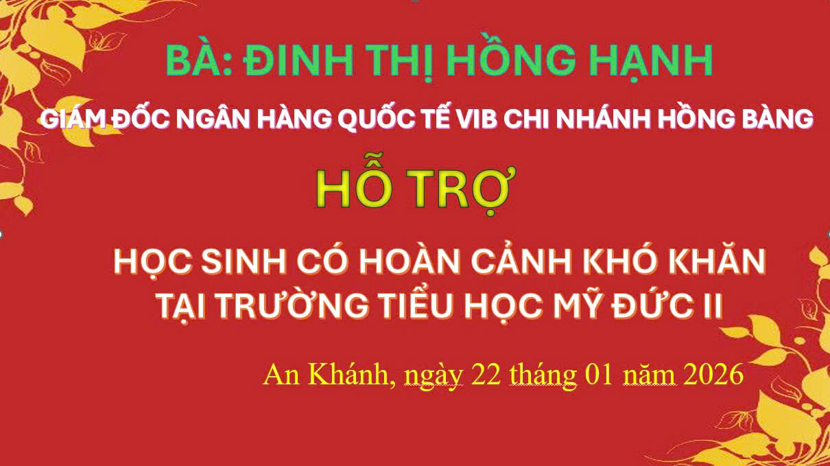 🗓️Ngày 22/01/2026, Trường Tiểu học Mỹ Đức II vui mừng được đón tiếp bà Đinh Thị Hồng Hạnh – Giám đốc Ngân hàng Quốc tế VIB, Chi nhánh Hồng Bàng đến thăm và trao quà hỗ trợ cho các em học sinh có hoàn cảnh khó khăn của nhà trường.