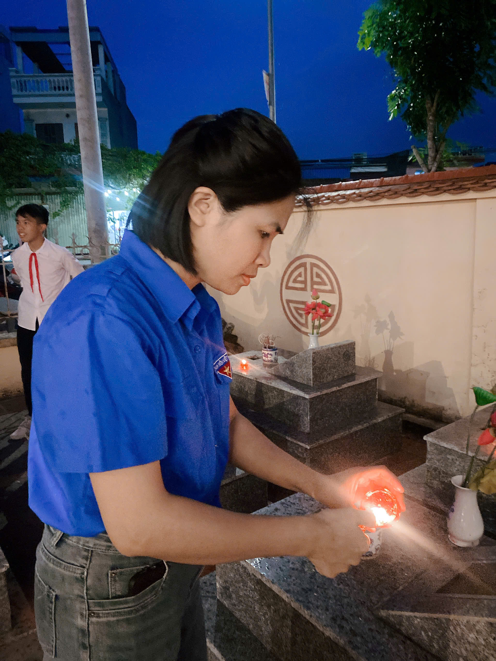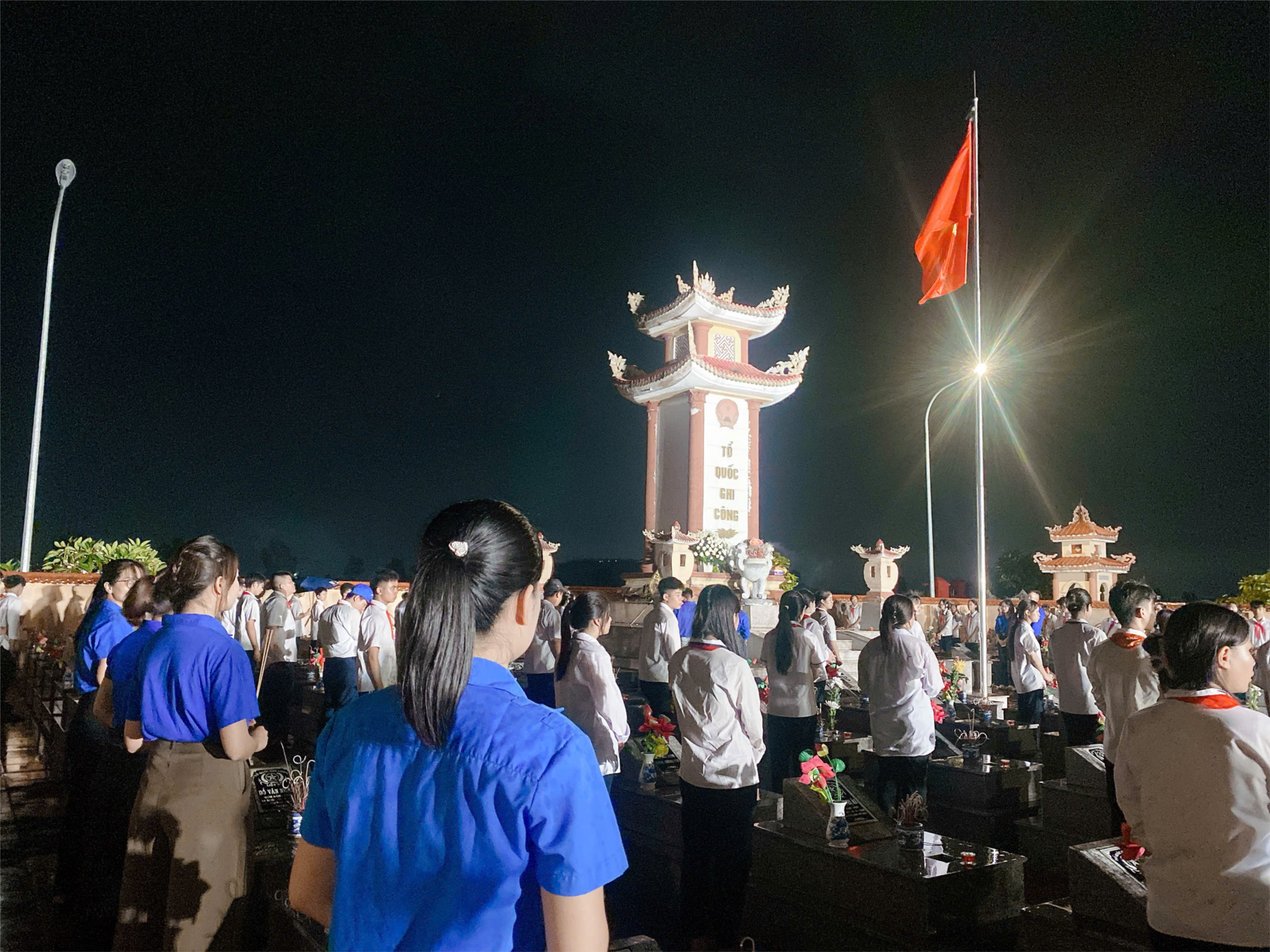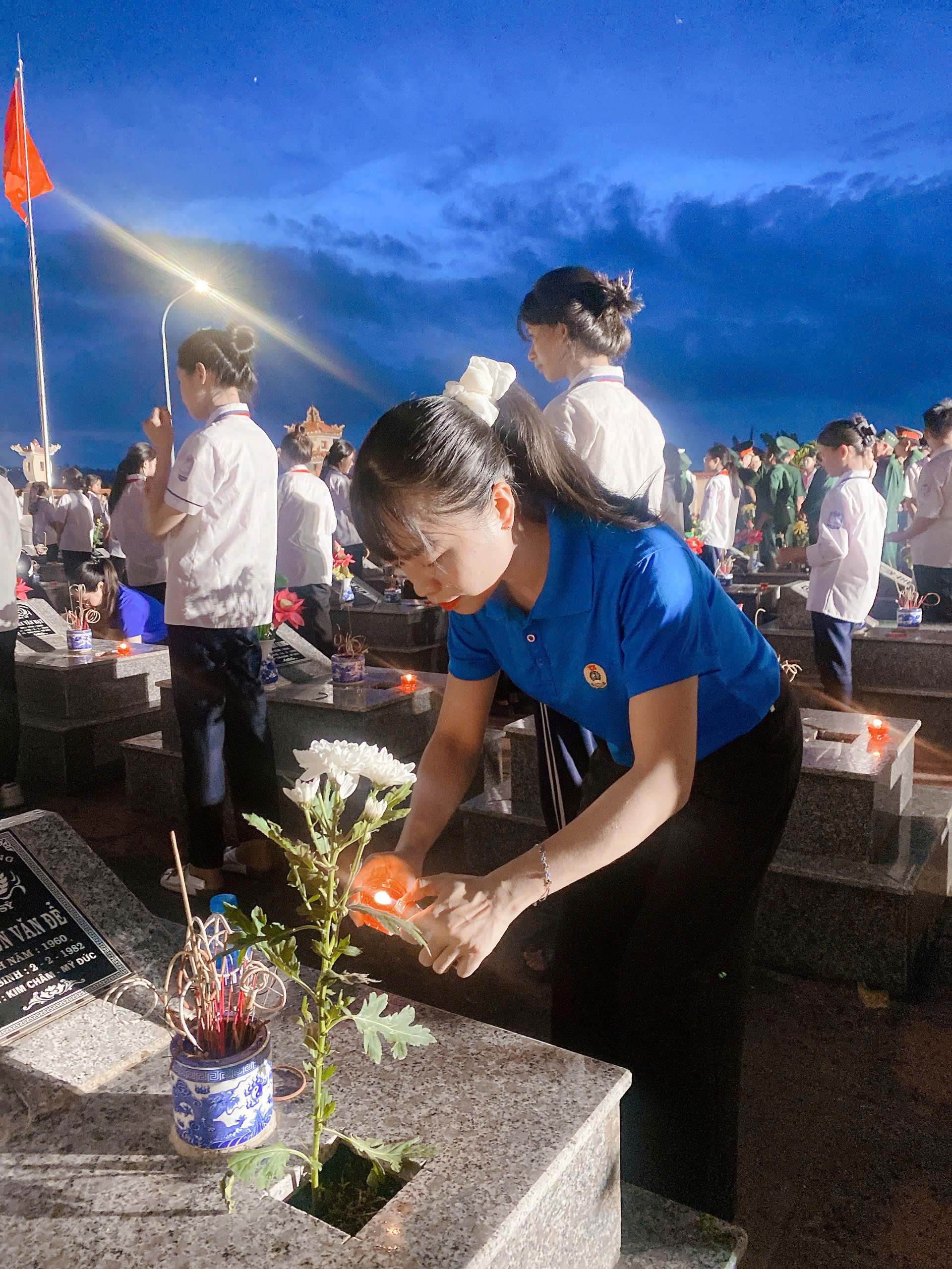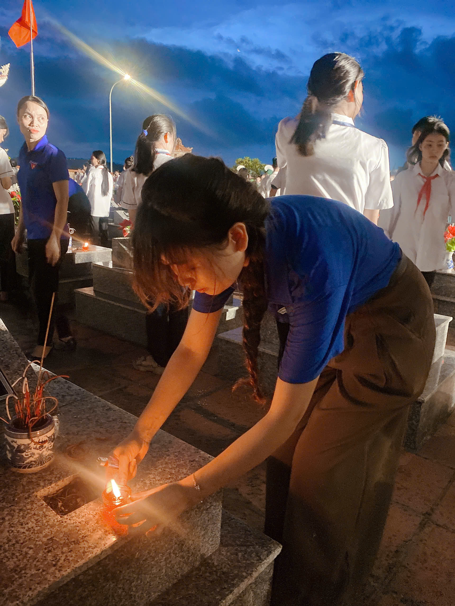 Trong không khí trang nghiêm và xúc động, từng ngọn nến được các bạn đoàn viên thắp sáng trên mỗi phần mộ liệt sĩ như lời tri ân sâu sắc gửi đến các anh hùng đã hy sinh vì độc lập, tự do của dân tộc. Ánh sáng lung linh của những ngọn nến đã sưởi ấm nghĩa trang trong đêm, thể hiện tấm lòng biết ơn và quyết tâm của thế hệ trẻ tiếp bước cha anh, sống xứng đáng với sự hy sinh to lớn của các thế hệ đi trước.