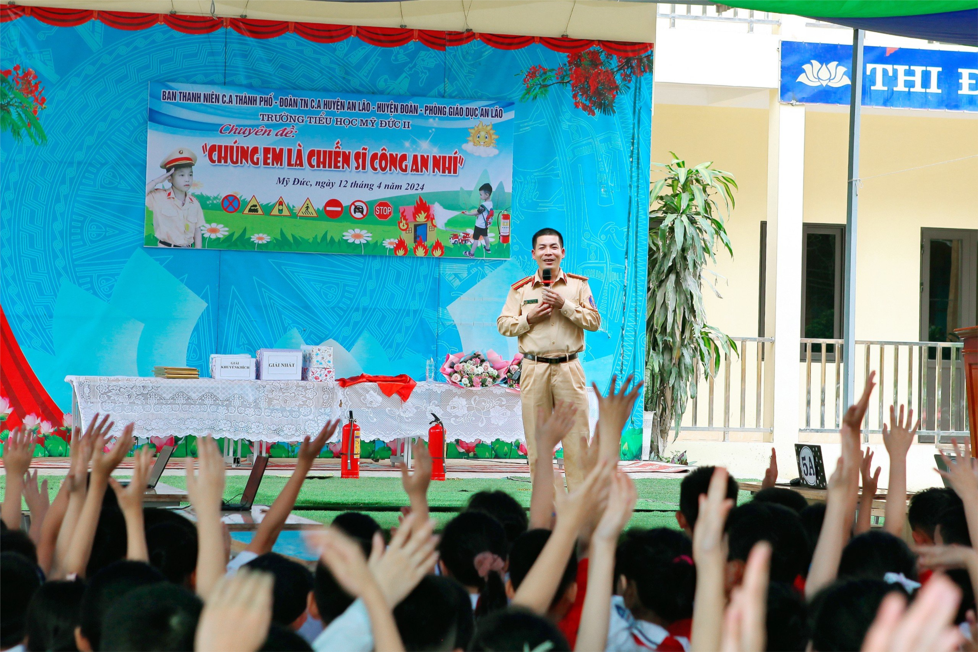 👉👉👉Thực hiện nhiệm vụ kế hoạch năm học và chương trình công tác Đội & phong trào thiếu nhi năm học 2023-2024 của trường Tiểu học Mỹ Đức II; nhằm tuyên truyền, giáo dục cho các em học sinh ý thức cũng như các kiến thức, kỹ năng khi tham gia giao thông & phòng chống cháy nổ, chiều ngày 12/04/2024 trường Tiểu học Mỹ Đức II phối hợp cùng Ban Thanh niên Công an thành phố, Đoàn Thanh niên Công an huyện An Lão long trọng tổ chức chuyên đề cấp huyện “Chúng em là chiến sĩ công an nhí”. Chuyên đề đã để lại dấu ấn sâu sắc đối với CB - GV - HS nhà trường trong việc đảm bảo an toàn giao thông và phòng chống cháy nổ ở mọi lúc, mọi nơi, mọi thời điểm.