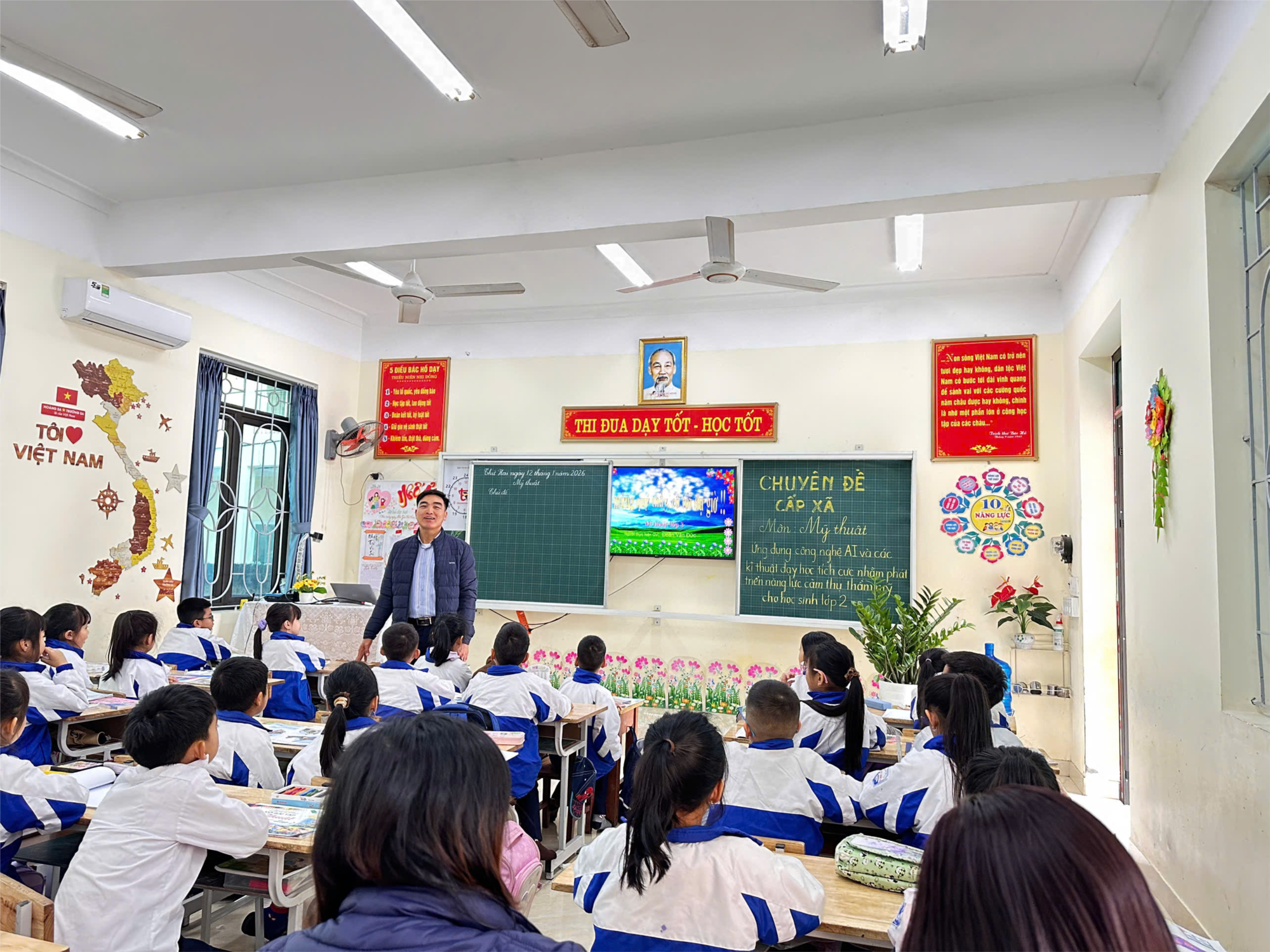📝Trong tiết dạy minh họa, thầy giáo Đoàn Văn Đức đã linh hoạt ứng dụng công nghệ AI, kết hợp các kĩ thuật dạy học tích cực, giúp học sinh hứng thú tham gia vào các hoạt động học tập. Các em học sinh lớp 2 được trải nghiệm, quan sát, sáng tạo và thể hiện cảm xúc thẩm mỹ một cách tự nhiên, phù hợp với lứa tuổi.🖼️