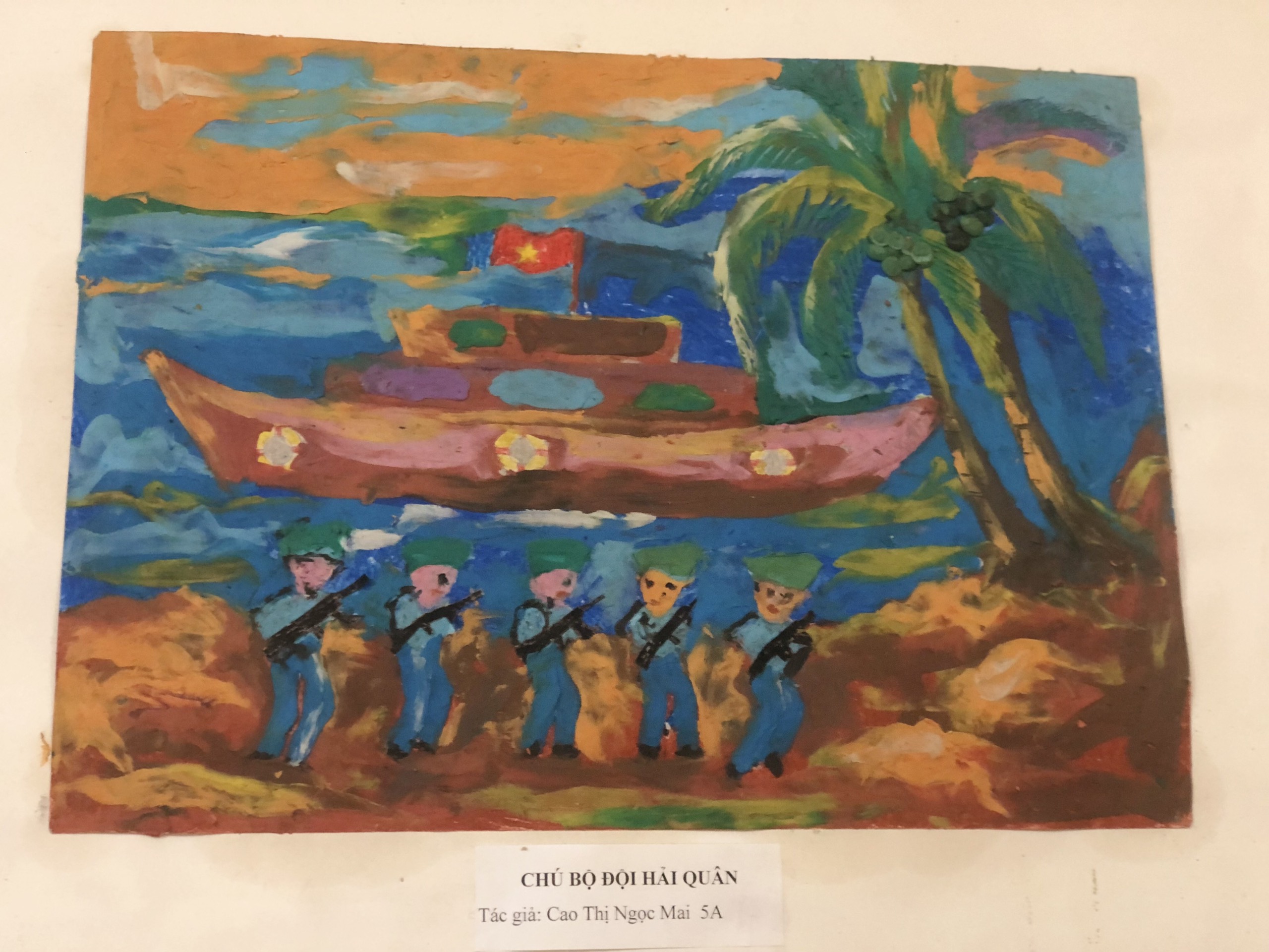 Với bố cục chính là hình ảnh các chú bộ đội hải quân đi tuần dọc bờ biển có hàng đưa xanh mát, phía xa là con tàu sẵn sàng ra khơi, em Mai muốn nhắn gửi tình yêu và lời cảm ơn tới các chú bộ đội hải quân Việt Nam, mong các chú luôn chắc tay súng để bảo vệ biển đảo của Tổ quốc.