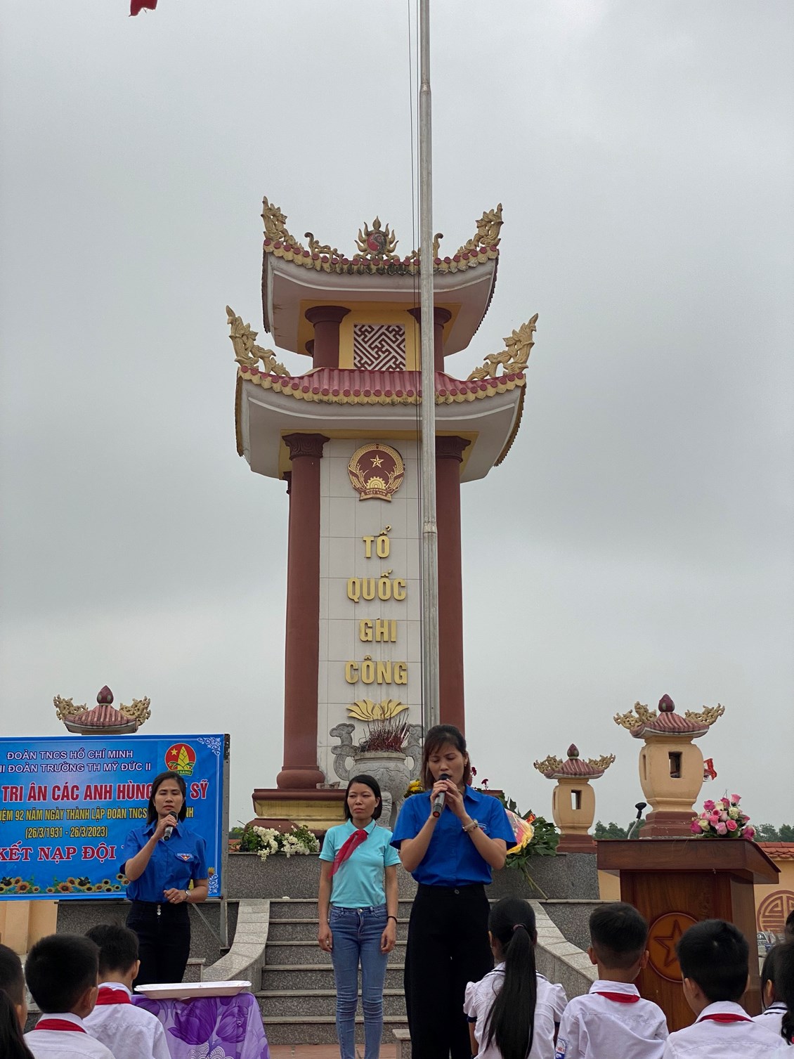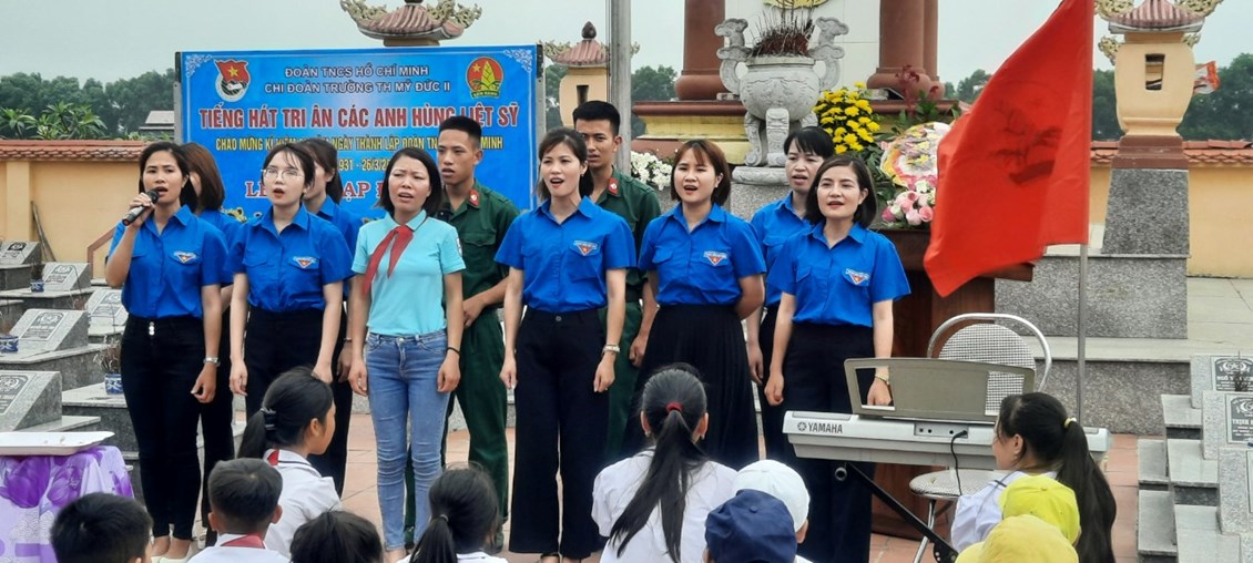 Hòa chung không khí thi đua của tuổi trẻ cả nước thiết thực chào mừng kỉ niệm 92 năm ngày thành lập Đoàn TNCS Hồ Chí Minh (26/3/1931 - 26/3/2023), được sự cho phép của Đảng ủy, UBND, UBMTTQ xã Mỹ Đức, BCH Đoàn xã, ngày 24/3/2023, Chi đoàn trường Tiểu học Mỹ Đức II long trọng thực hiện chương trình: “Tiếng hát tri ân” nhằm bày tỏ lòng thành kính và biết ơn sâu sắc tới các vị anh hùng liệt sĩ nói chung, các liệt sĩ thanh niên nói riêng đã ngã xuống cho độc lập tự do của Tổ quốc. Chương trình gồm các nội dung: Lau dọn, vệ sinh từng ngôi mộ; thắp hương tưởng nhớ, Lễ kết nạp đội viên, Tiếng hát tri ân. Chương trình thay lời muốn nói: Chúng tôi - những đoàn viên thanh niên trường tiểu học Mỹ Đức II sẽ luôn ra sức học tập, phấn đấu để xứng đánh là thanh niên thế hệ Hồ Chí Minh.