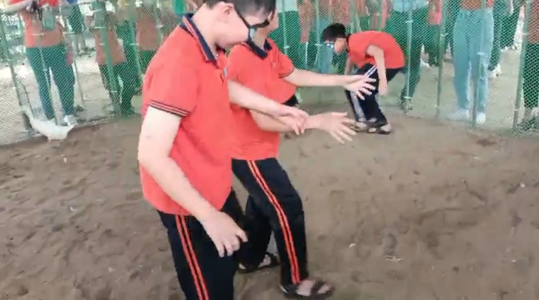 Các em học sinh Trường Tiểu học Mỹ Đức II hào hứng tham gia trò chơi dân gian" Bịt mắt bắt vịt" khi đi học tập trải nghiệm